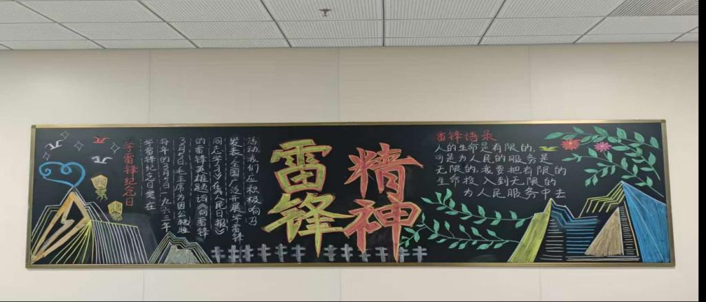 各班级围绕雷锋精神、志愿服务、时代新风等主题精心设计版面、撰写内容,将雷锋事迹、名言警句、青春感悟等融入黑板报创作中,通过色彩鲜明的图画、简洁有力的文字,生动展现雷锋精神的丰富内涵。同学们在构思、绘制、展示的全过程中,深刻体悟雷锋精神的时代价值,以青春笔触传递向上向善的正能量。
