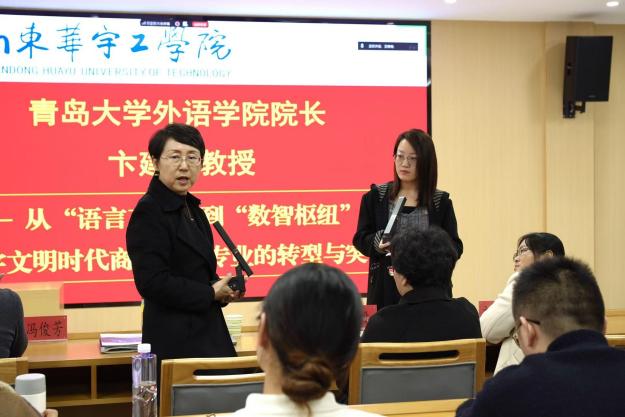 2025年11月14日下午,12号楼学术报告厅201内座无虚席,我院特邀请青岛大学外语学院卞建华教授,作题为“从‘语言工具’到‘数智枢纽’:数字文明时代商务英语专业的转型与突围”的专题学术讲座。我院商务英语专业全体教师及各年级学生代表参加此次讲座,共同探寻专业发展新路径。